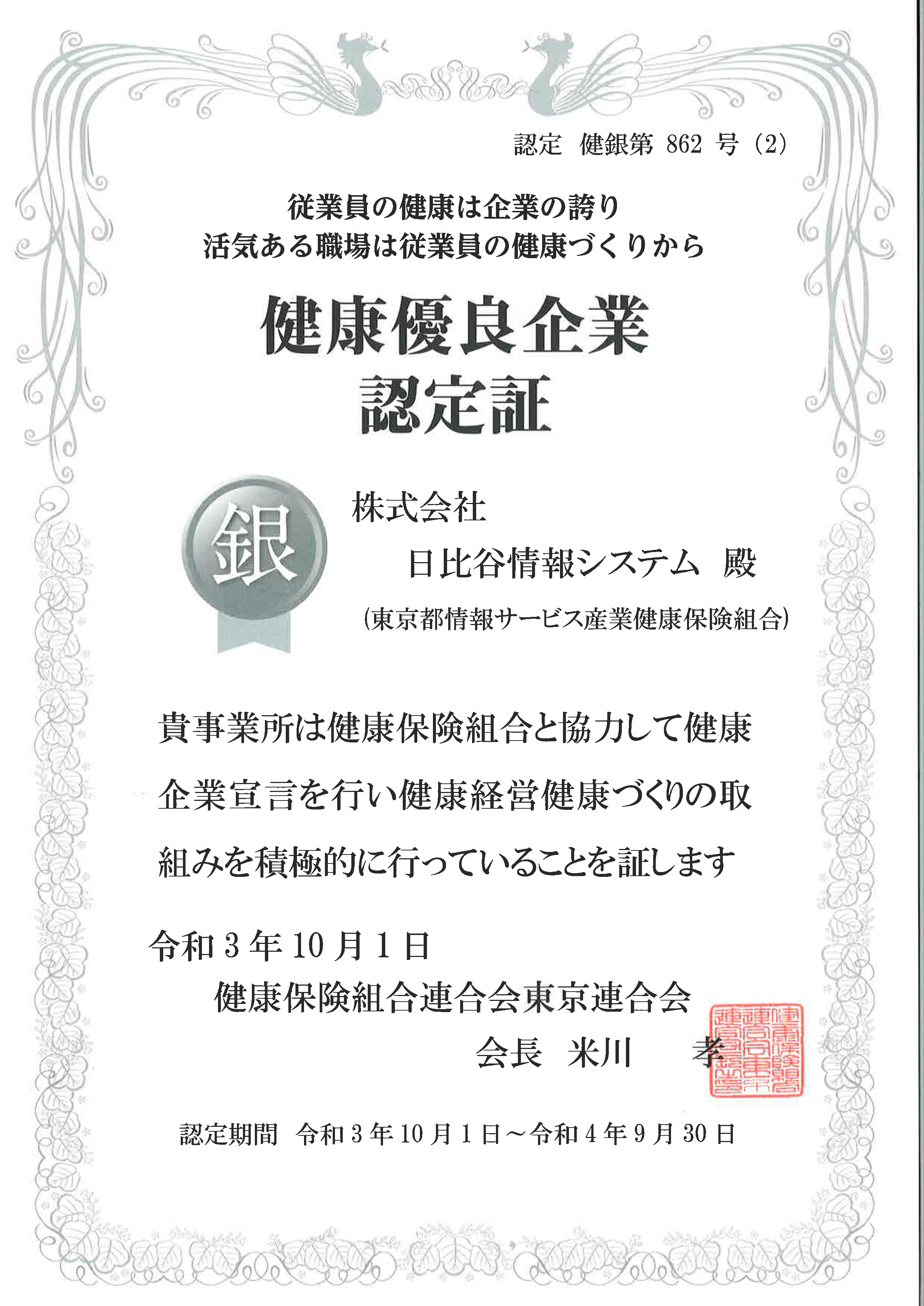 日比谷情報システムは、健康保険組合連合会東京連合会に2018年8月に「健康企業宣言」を行い、積極的な健康経営づくりの取り組みを継続し、2021年10月1日付で『健康優良企業 銀の認定証』を更新しました。